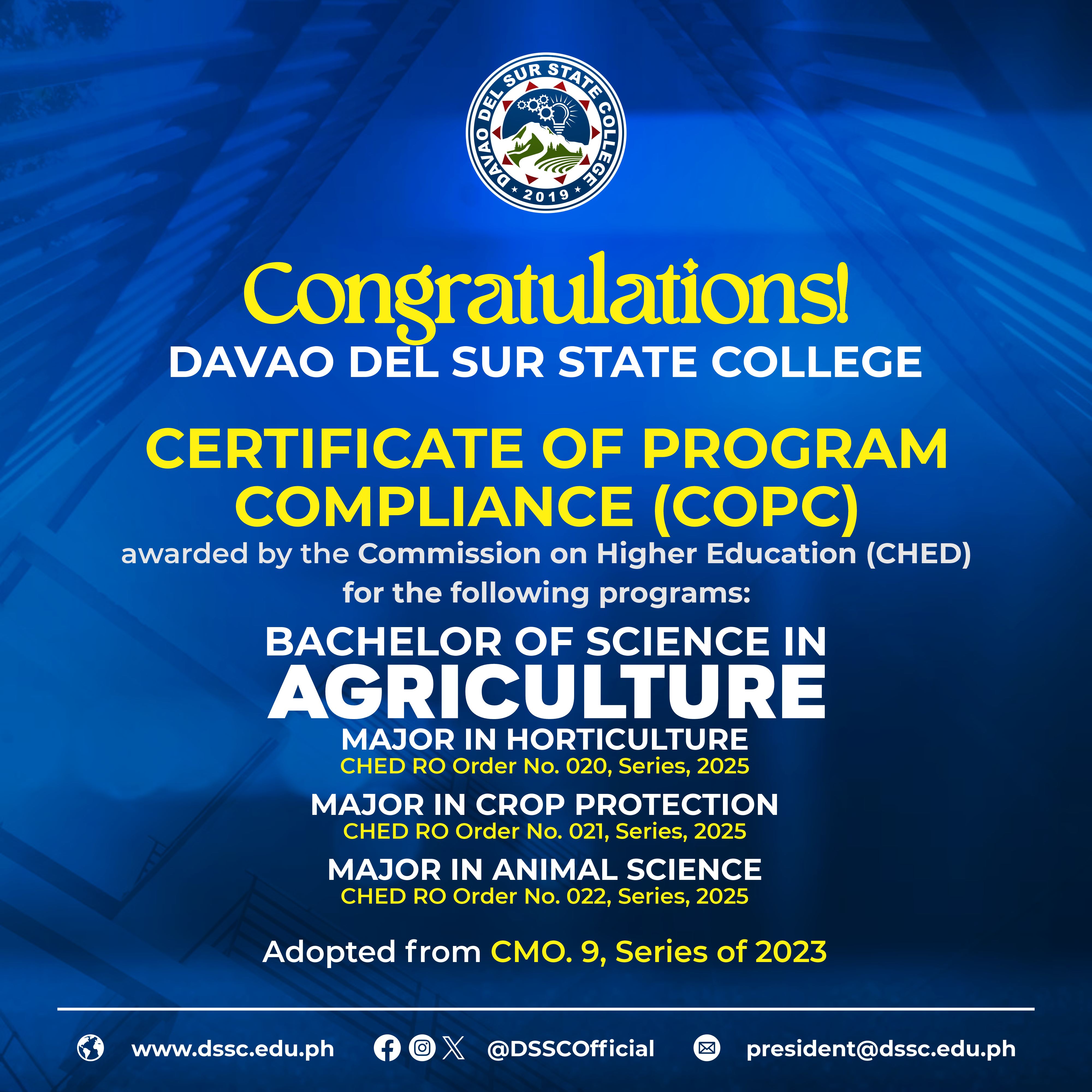 Davao del Sur State College (DSSC) proudly announces the awarding of Certificates of Program Compliance (COPC) by the Commission on Higher Education (CHED) for its Bachelor of Science in Agriculture with the following majors: Crop Protection, Horticulture, and Animal Science.
