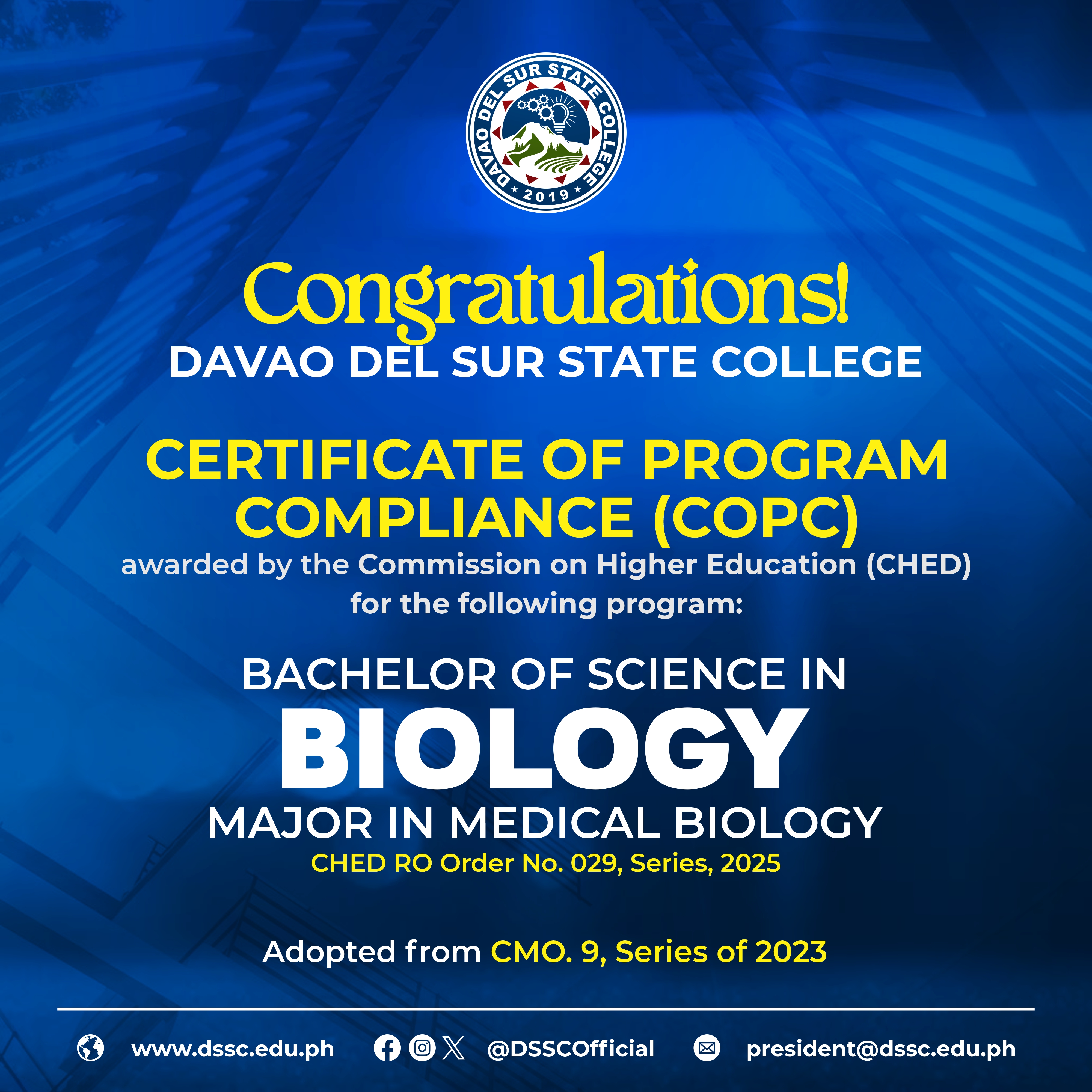 Davao del Sur State College (DSSC) proudly announces the awarding of the Certificate of Program Compliance (COPC) by the Commission on Higher Education (CHED) for its Bachelor of Science in Biology, Major in Medical Biology.