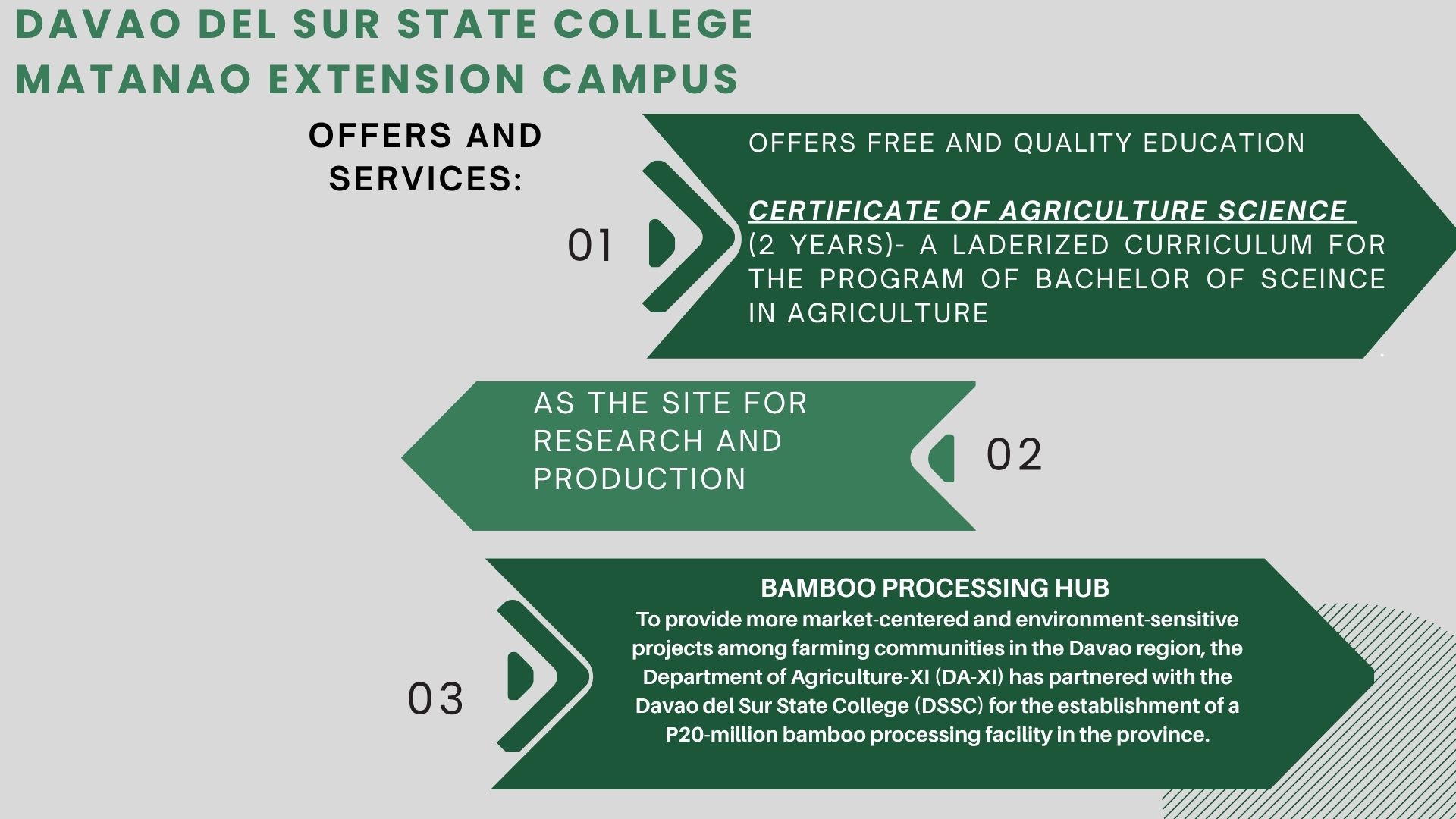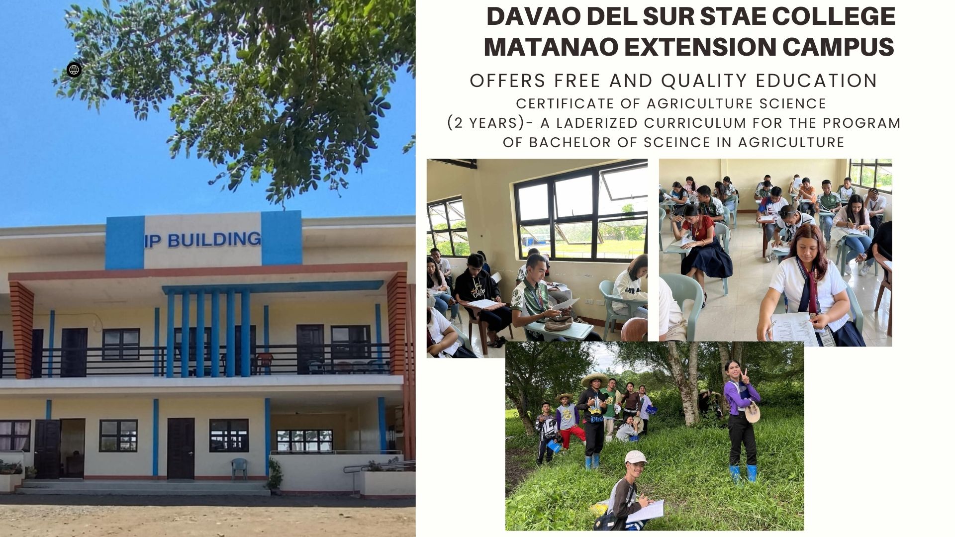 Davao del Sur State College (DSSC) Matanao Extension Campus offers 2-year Certificate of Agricultural Science (CAS) to cater students in the Municipality of Matanao and neighboring Municipalities