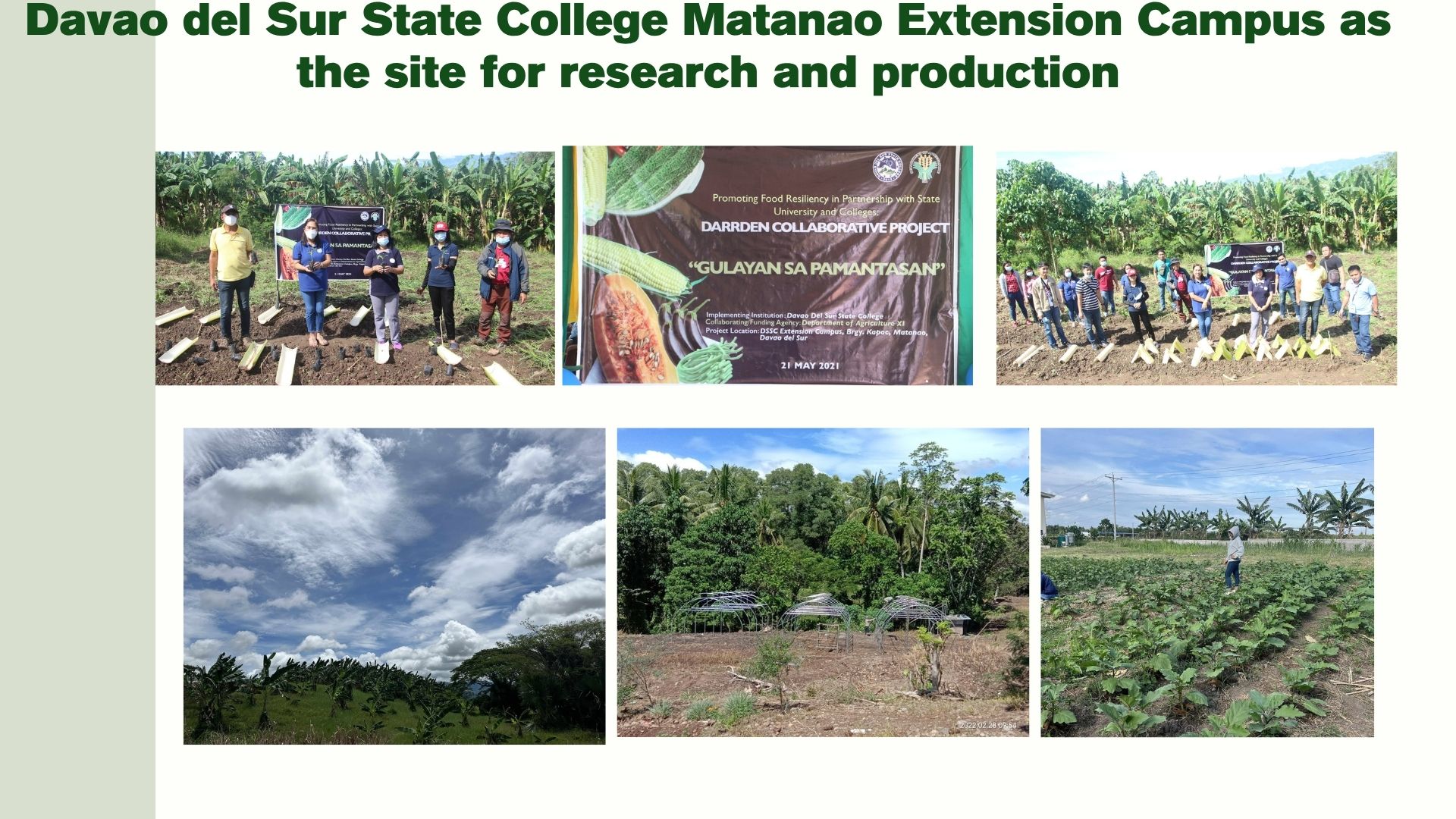 Matanao Extension campus was acquired in 1998 through the leadership of Dr. Francisco G. Ladaga as the College president of Southern Philippines Agri-Business and Marine and Aquatic School of Technology (SPAMAST). It was the Experimental and Demo Farm of the College then, for student research studies and some income generating projects related to crop production. In 1999-2001 classes for DAT/BAT program was conducted in Matanao Ext Campus and later transferred to main campus due to lack of facilities needed for accreditation reasons.
