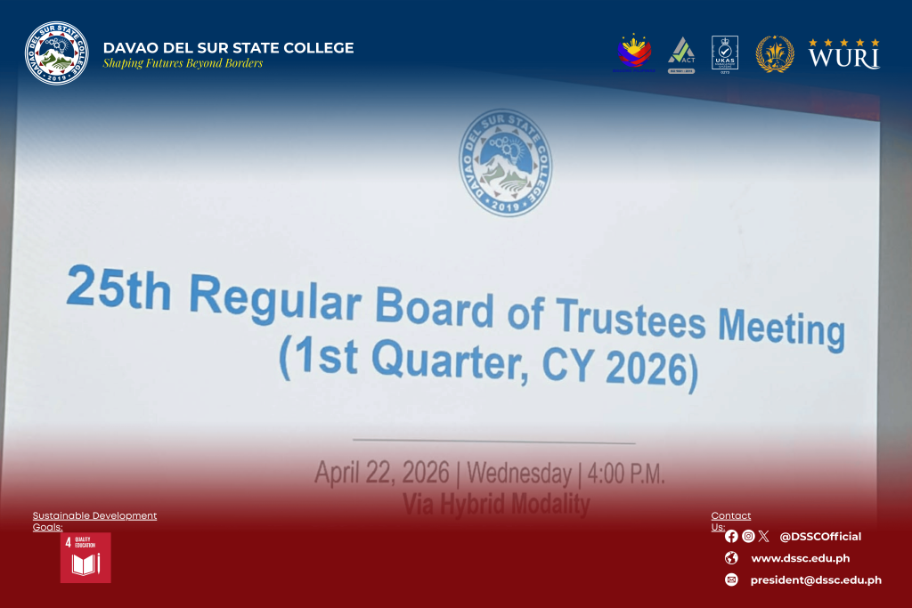 Davao del Sur State College convened its 25th Regular Board of Trustees (BOT) Meeting through a hybrid modality, on April 22, 2026, bringing together board members both onsite and virtually to deliberate on key institutional matters.