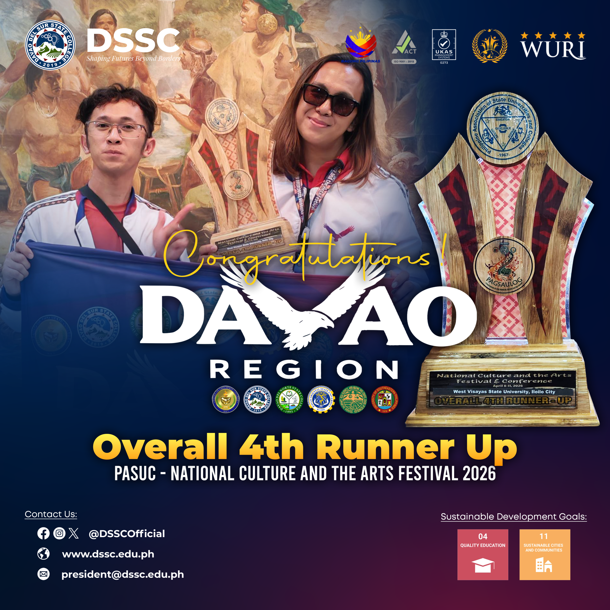 Region XI finished 4th Runner-Up overall at the PASUC National Culture and the Arts Festival (NCAF) 2026 held in Iloilo City.
