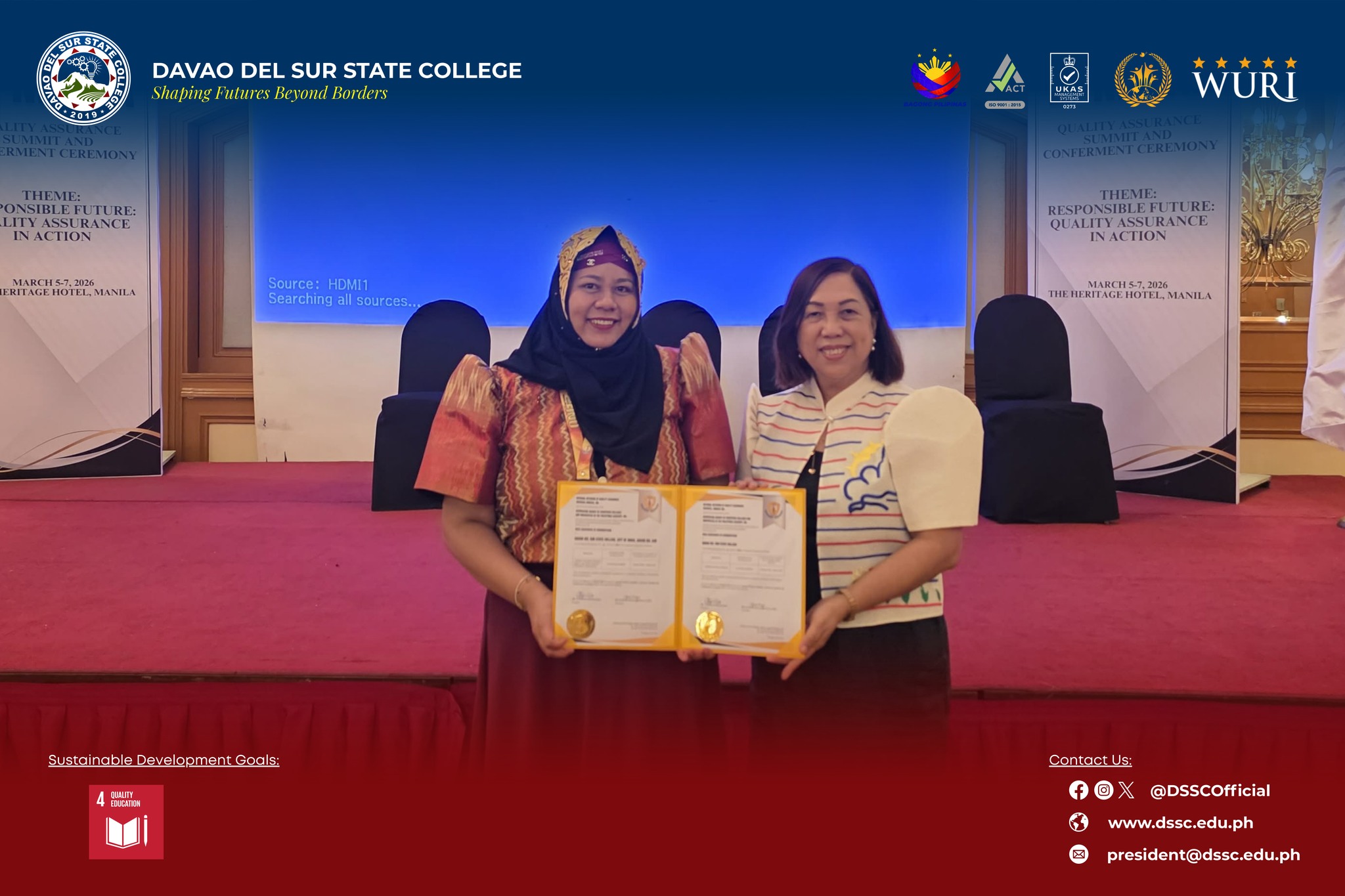 Davao del Sur State College (DSSC) received recognition at the 2nd Quality Assurance Summit and Conferment Ceremony organized by the National Network of Quality Assurance Agencies (NNQAA) at The Heritage Hotel Manila, on March 5-7, 2026.