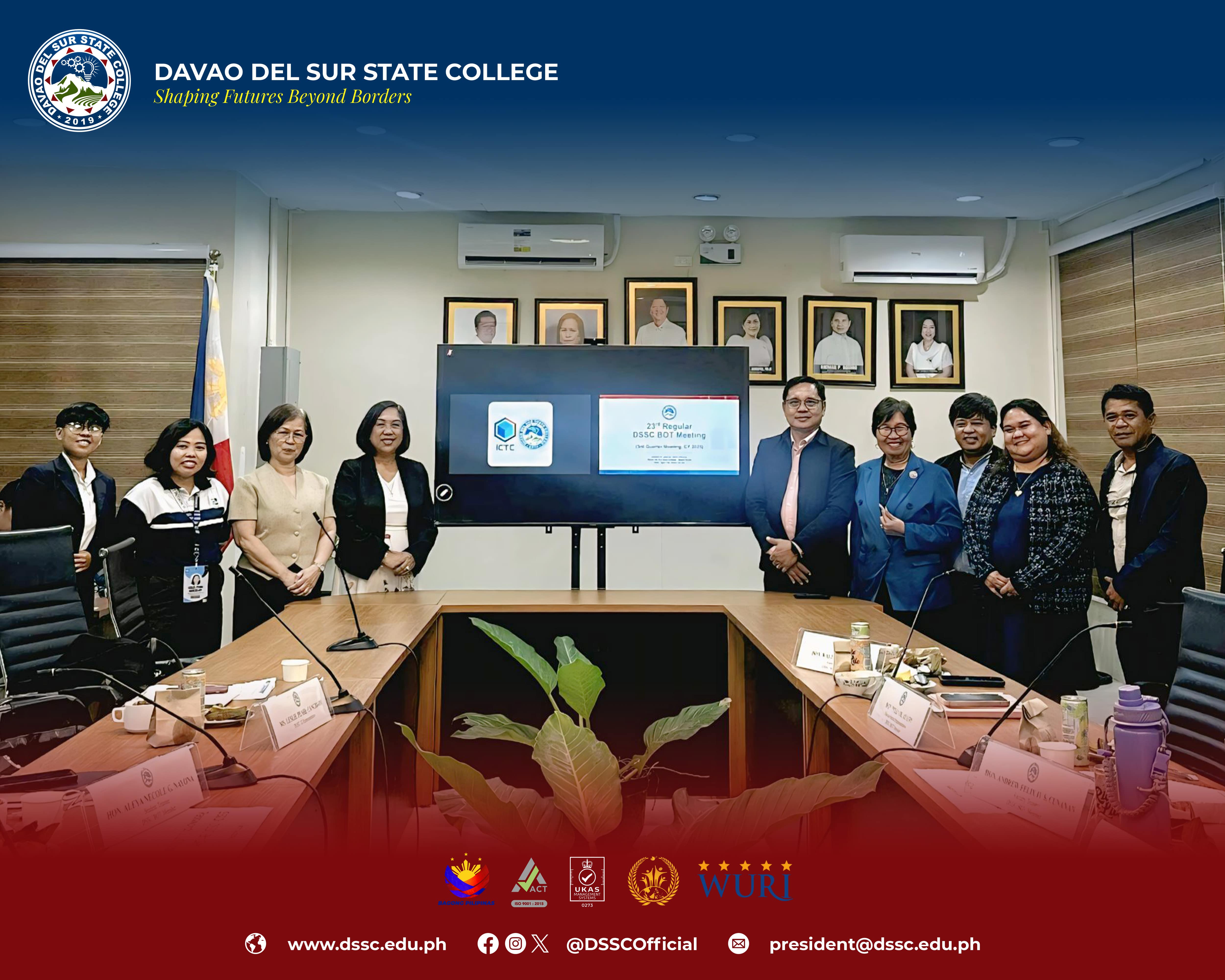 Davao del Sur State College (DSSC) conducted its 23rd Regular Board of Trustees (BOT) Meeting on October 1, 2025. It was held at the DSSC Board Room, with Davao del Sur State College President Dr. Augie E. Fuentes and Board members in attendance. The session was chaired by Dr. Ricmar P. Aquino, CHED Commissioner and BOT Chairperson-Designate.